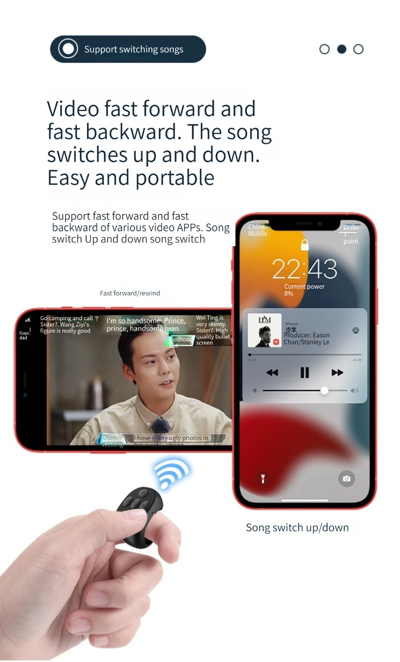 Product features: Selfie, like, lock screen, switch songs, turn pages up, down, left and right, fast forward and rewind, volume increase and decrease
