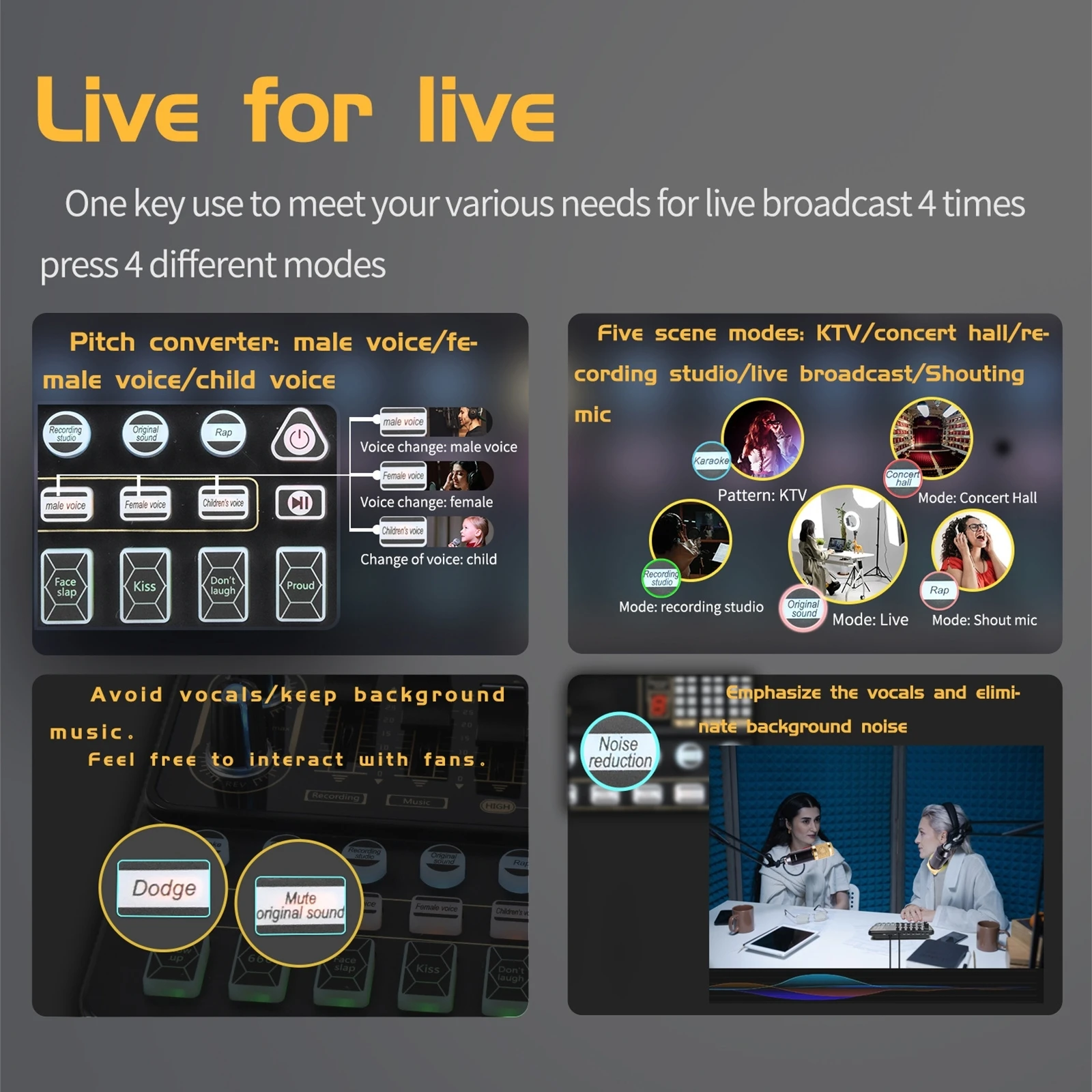 5. Support four APP with two mic and headphone to live and record in PC or phones